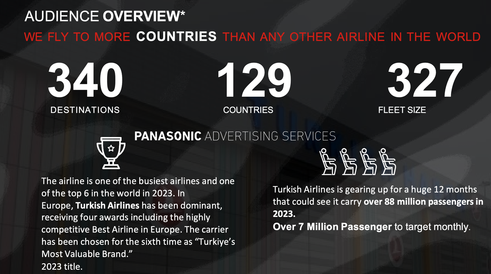 Turkish Airlines operates the largest international network in the worldâflying to over 340 destinations across 129 countries. With a modern fleet of 327 aircraft and more than 7 million passengers monthly, this campaign is your gateway to engage a globally mobile, affluent audience inside the cabin and across onboard digital platforms.