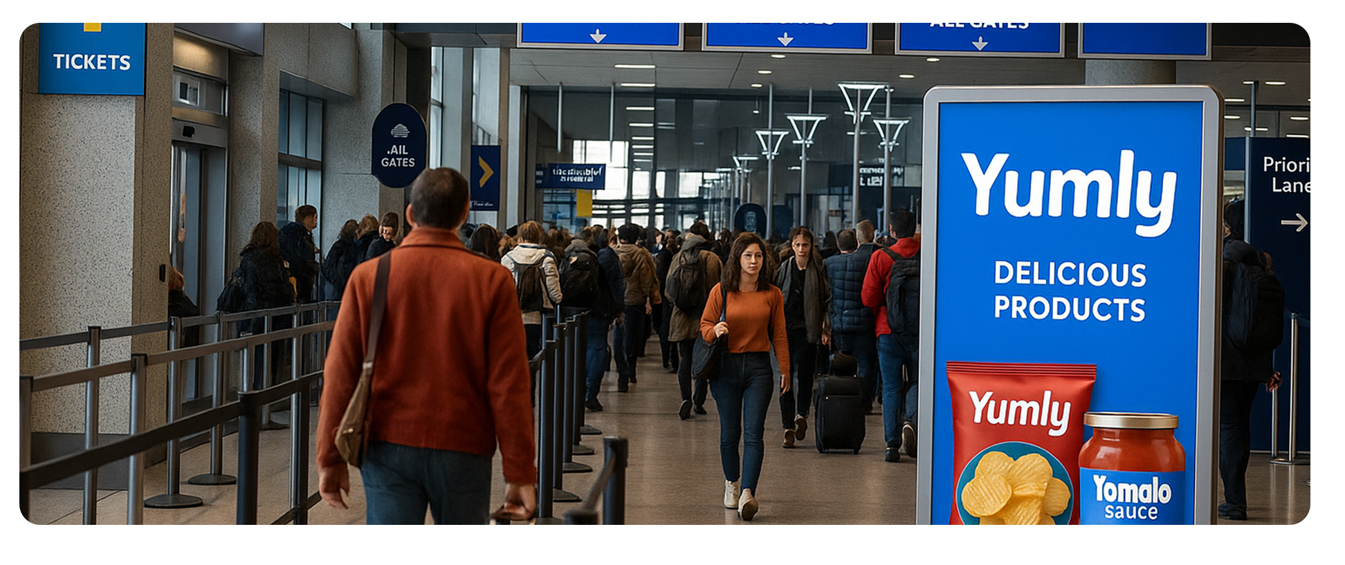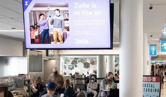 AUS features digital HD screens placed at eye-level, overhead, and near high-footfall zones, including TSA checkpoints, food concessions, and boarding gates.