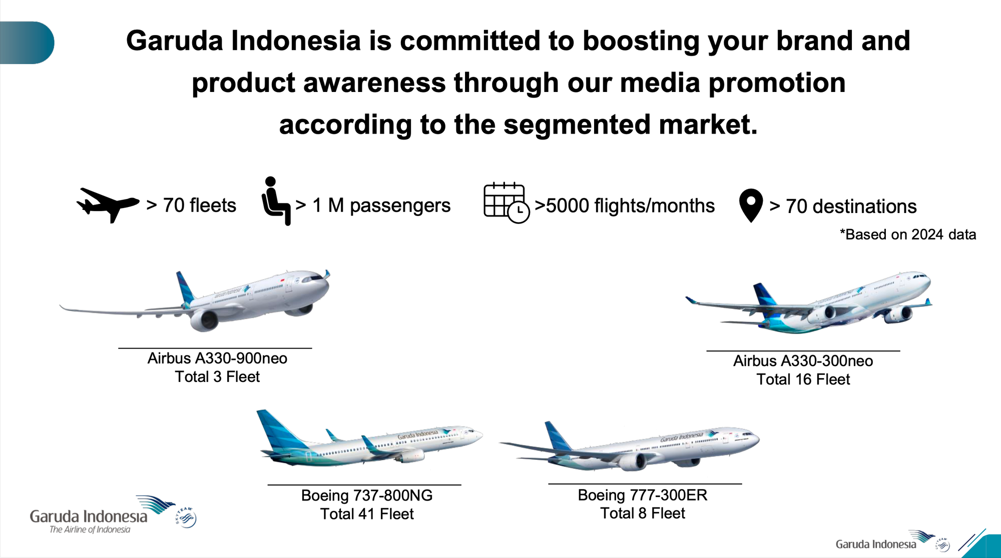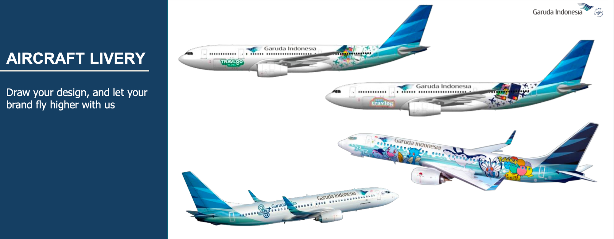 Turn an entire Garuda Indonesia aircraft into your flying billboard with sticker or painted livery. Available for 6-month or annual exposure durations.
