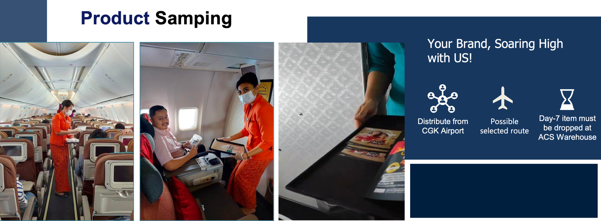 Distribute your product samples directly into the hands of business and leisure travelers. Managed by Garudaâs cabin crew with verified drop-off logistics.
