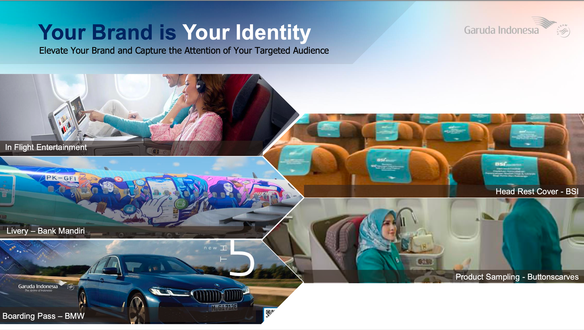 Garuda Indonesia, one of only ten certified 5-Star Airlines globally, offers unparalleled access to over 35 million premium travelers annually through an elite suite of inflight advertising platforms. From inflight screens to boarding passes and aircraft livery, your brand will own every key touchpoint throughout the travel journeyâbefore takeoff to final descent.