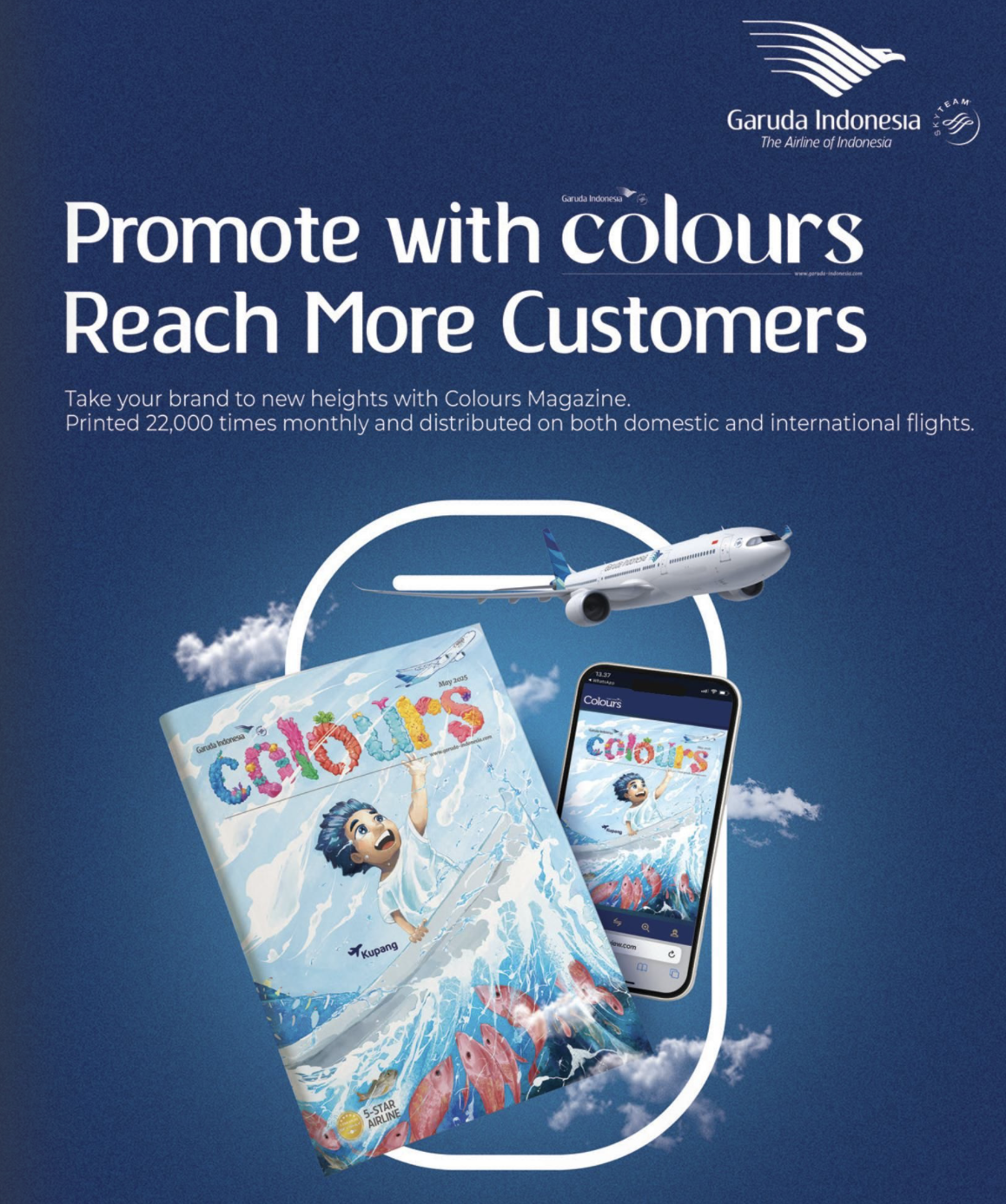 Advertise in Garudaâs award-winning Colours magazineâavailable in seat pockets, executive lounges, and via digital platforms (iOS, Android, VersoView).
