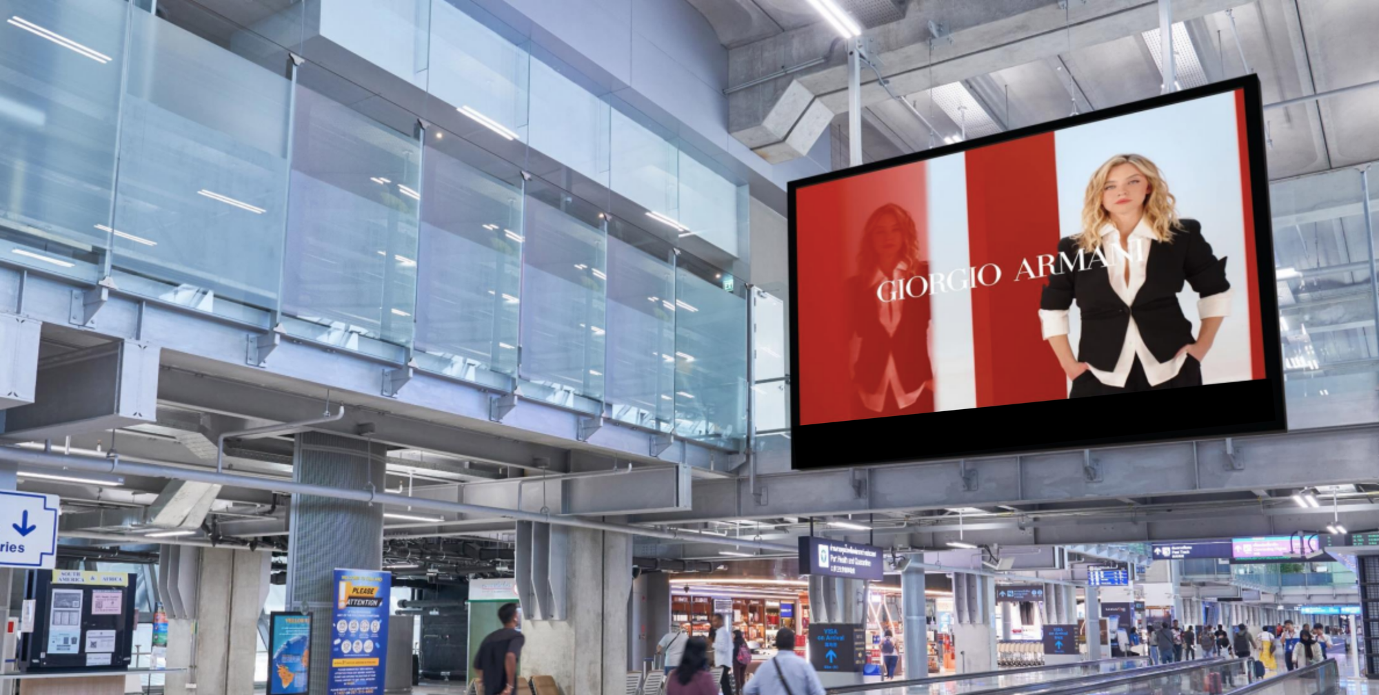 Above the passport control area, this impactful lightbox creates an engaging brand experience for arriving passengers. The positive messaging and welcoming visuals make this an excellent opportunity to leave a strong impression on a high-value audience.