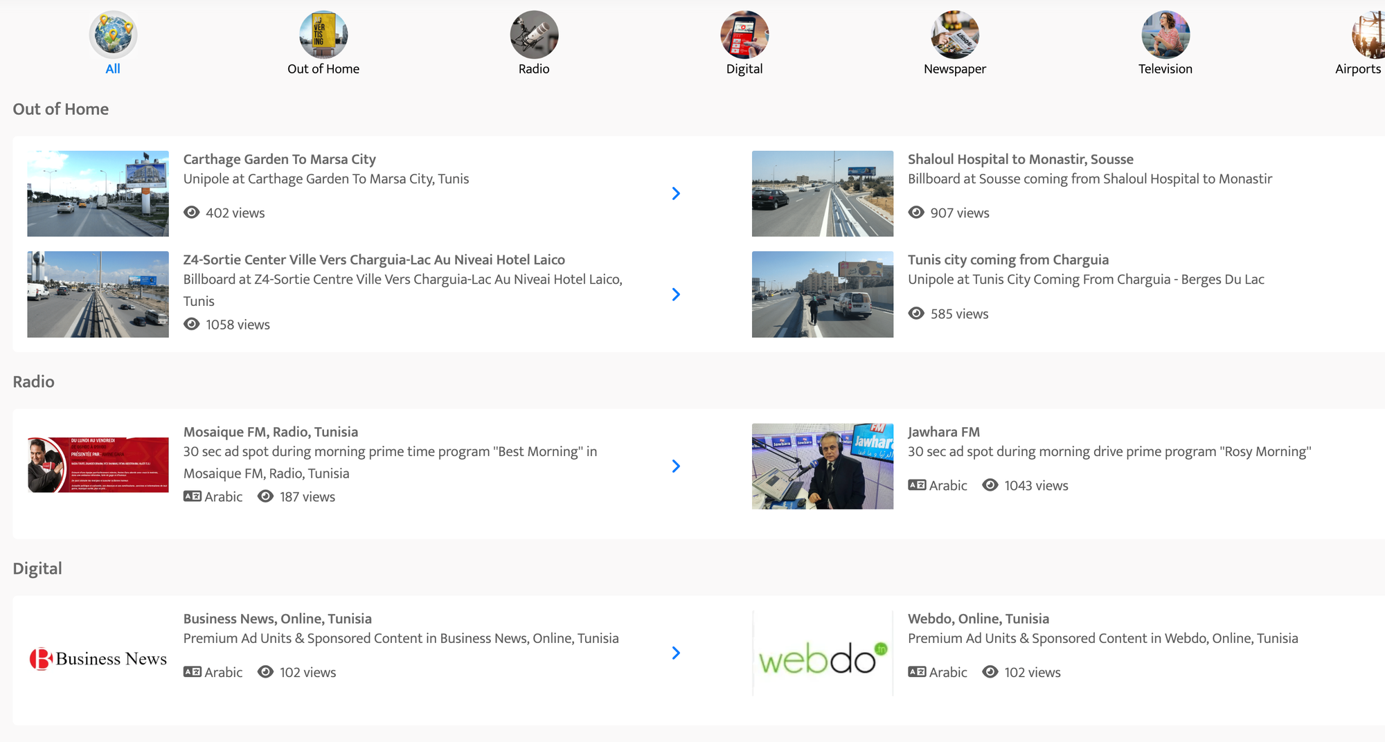 Whether you aim to influence Tunisian consumers, business leaders, or Arabic-speaking urban audiences, our exclusive Tunisia 2026 Media Package ensures your message cuts through the clutter. This full-spectrum campaign delivers high visibility across OOH, airports, digital, radio, print, and television, strategically located in key urban and travel hubs like Tunis, Sousse, Monastir, and Carthage Airport .